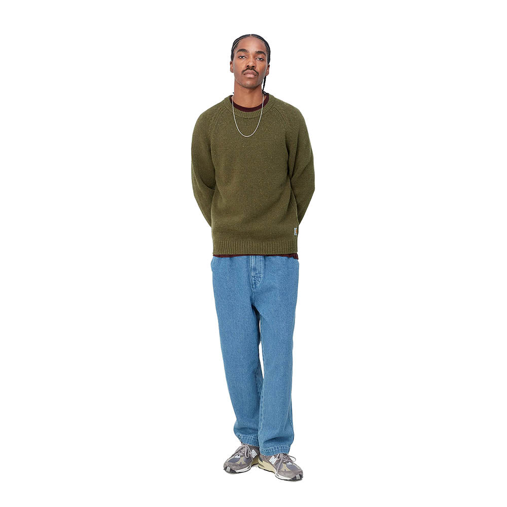 Il Carhartt WIP Anglistic Sweater è un maglione dall'aspetto avvolgente e dalla vestibilità comoda, perfetto per uomini che vogliono combinare stile e praticità. Questo maglione classico, firmato dal famoso brand Carhartt WIP, è realizzato in misto lana per offrire un'esperienza di calore e comfort senza eguali. Il colore è versatile e accattivante, facilmente abbinabile sia con un paio di jeans che con dei pantaloni più eleganti. La trama del maglione è caratterizzata da un design semplice ma ricercato, con il logo del brand discretamente situato in basso. La vestibilità è regolare, ideale per ogni tipo di corporatura. Con il suo stile pulito e raffinato, il Carhartt WIP Anglistic Sweater è adatto sia per il tempo libero che per occasioni più formali, rappresentando un capo fondamentale per ogni guardaroba maschile. Non manca la resistenza e la qualità, garantite dal marchio Carhartt WIP, conosciuto e amato per i suoi prodotti duraturi e di alta qualità.